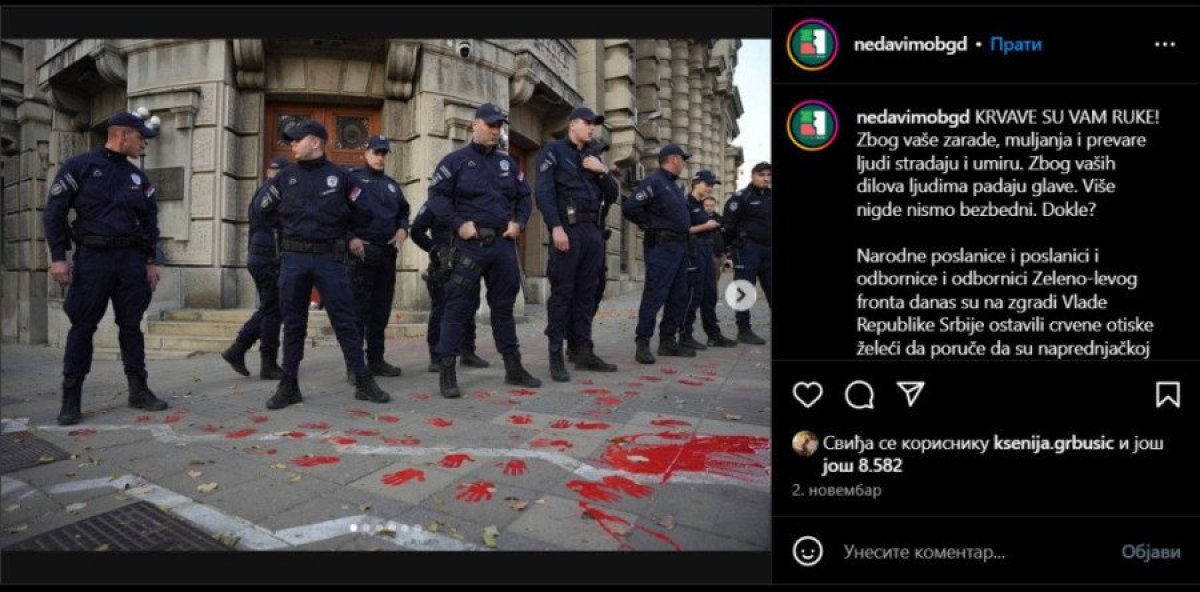 Način protesta, bezobzirnost u ophođenju, sukobe sa snagama reda i naravno performans “krvavih ruku” uz parolu “Krvave su vam ruke”, u Srbiji već nakon same tragedije u Novom Sadu, a po uzoru na akcije CodePink, prvi su počeli da uzvikuju predstavnici Zeleno-levog fronta pod komandom Radomira Lazovića, kao i “student” Pavle Cicvarić, Mila Pajić i predstavnici “neformalne” grupe “Stav”, po ugledu na one na univerzitetu MIT u Masačusetsu.