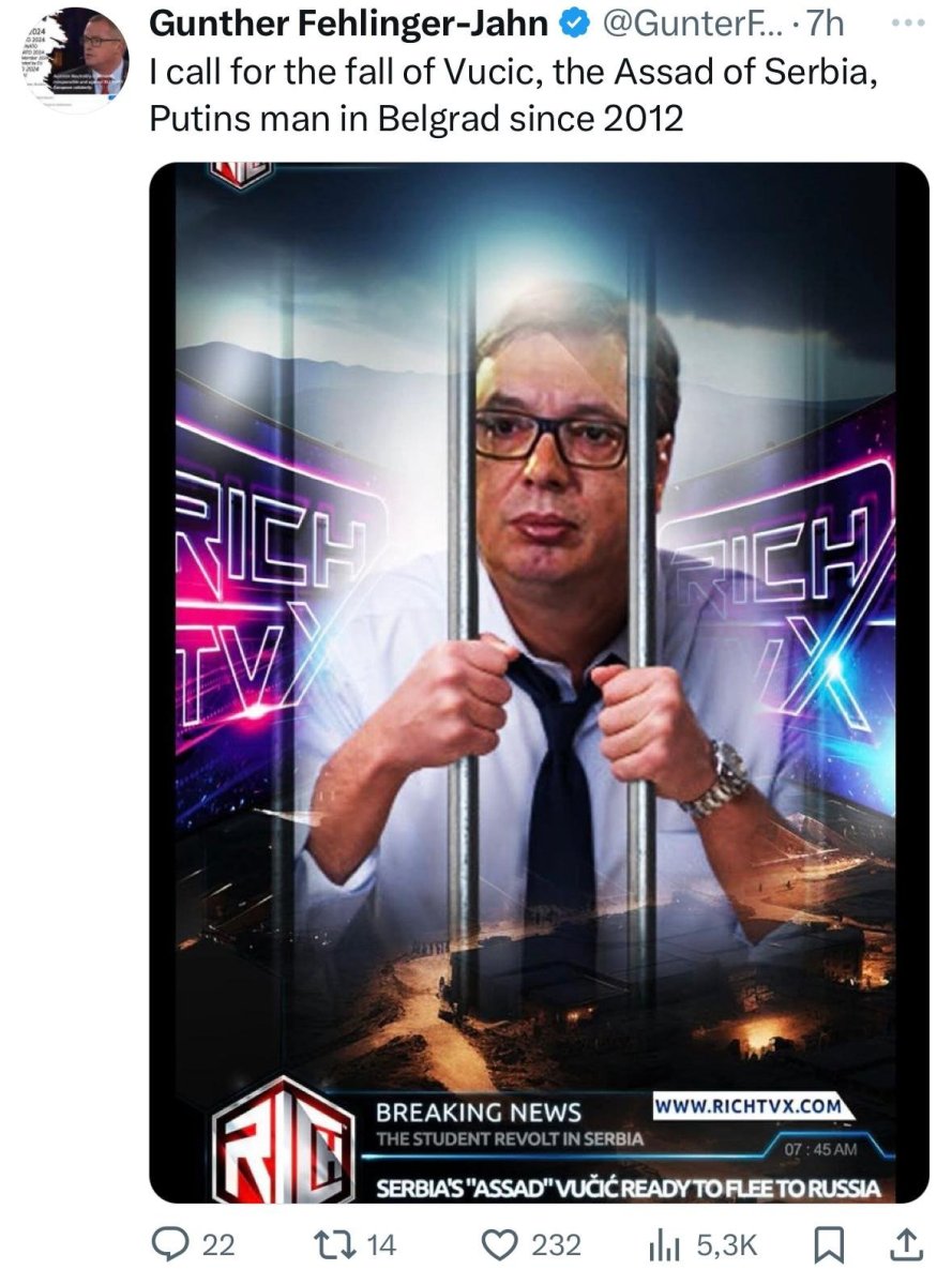 On se oglasio na Iksu i poručio da “poziva na rušenje Vučića”, kog je nazvao “srpskim Asadom” i “čovekom Vladimira Putina u Beogradu od 2012. godine”.